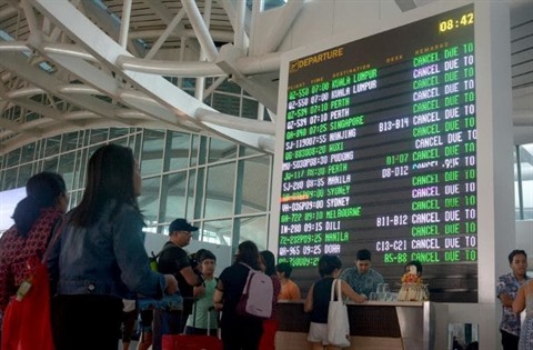 | Des touristes bloqués à l'aéroport Ngurah Rai à Denpasar, sur l'île de Bali, le 29 juin, après l'éruption d'un volcan. |