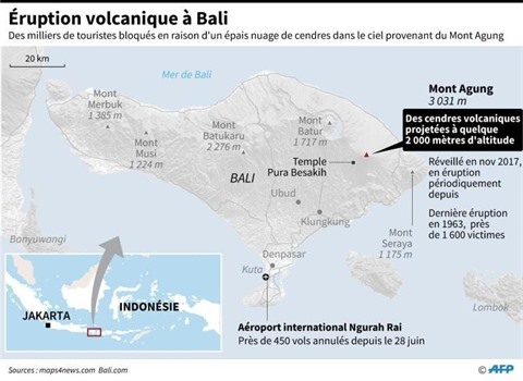 Compte tenu du danger pour le trafic aérien des cendres volcaniques du mont Agung projetées à quelque 2.000 mètres d'altitude, l'aéroport Ngurah Rai avait été fermé à 0300 (19h00 GMT jeudi 28 juin) avant de rouvrir à 14h30 (07h30 GMT). "Étant donné que la propagation de cendres dans l'espace aérien n'est plus un danger" pour les avions, en raison du changement de direction des vents, l'aéroport a rouvert, a déclaré le directeur des autorités aéroportuaires locales, Herson, qui n'a qu'un patronyme comme nombre d'Indonésiens.