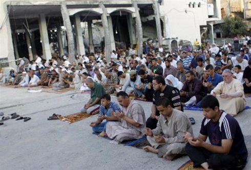 | Des musulmans palestiniens prient en plein air au premier jour de la fête du Fitr, près d'une mosquée endommagée par les frappes israéliennes à Rafah, au Sud de la bande de Gaza, le 28 juillet. Photo : AFP/VNA/CVN |