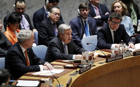 | Le secrétaire général de l'ONU, Antonio Guterres (centre), lors d'une réunion du |