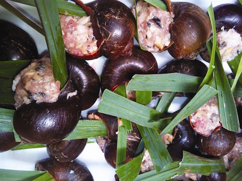 4. Enfoncer une feuille de gingembre au fond de chaque coquille d’escargot, en laissant dépasser les deux extrémités. Remplir chaque coquille avec une portion de farce.