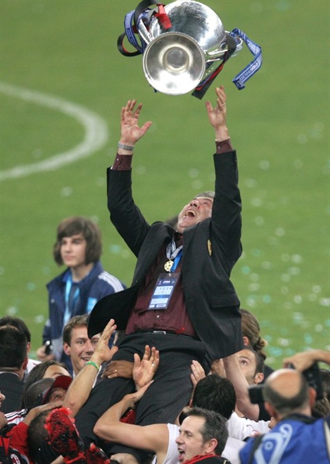 | La joie de l'entraîneur italien de l'AC Milan, Carlo Ancelotti, porté en triomphe par ses joueurs, après la victoire face à Liverpool, en finale de la Ligue des Champions, le 23 mai 2007 à Athènes. |