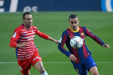 Le défenseur de Grenade Victor Diaz (gauche) à la poursuite de l'attaquant du Barça Antoine Griezmann, le 29 avril à Barcelone. Photo : AFP/VNA/CVN |