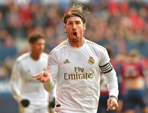 | Le capitaine du Real Madrid Sergio Ramos buteur contre Osasuna, le 9 février à Pampelune. |