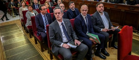 | Les dirigeants indépendantistes catalans devant la Cour suprême à Barcelone, le 12 février en Espagne. |