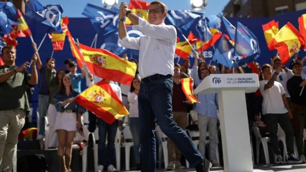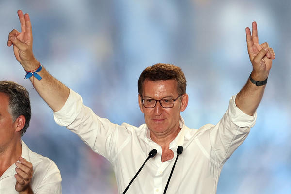 | Alberto Núñez Feijóo, président du Parti populaire, est acclamé par ses partisans le 24 septembre à Madrid. |