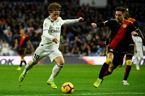 | Le meneur de jeu croate du Real Luka Modric (g) face au défenseur du Rayo Vallecano Alex Moreno, le 15 décembre 2018 à Madrid. |