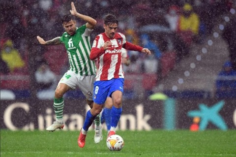 | L'attaquant français de l'Atlético Maddrid Antoine Griezmann, sous la pression de l'attaquant du Betis Séville Aitor Ruibal, lors de la 12e journée de Liga, le 31 octobre au Wanda Metropolitano Stadium. |