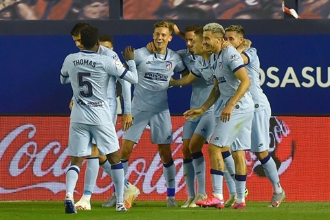 | Les joueurs de l'Atlético de Madrid fêtent leur victoire face à Osasuna, à Pampelune, le 17 juin. |