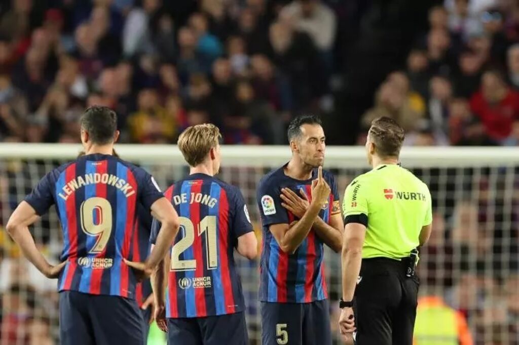 | Le milieu Sergio Busquets, qui demande des explications à l'arbitre, et ses coéquipiers barcelonais, tout frais champions d'Espagne, ont été surpris à domicile par la Real Sociedad, le 20 mai. |