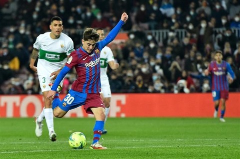 | Le milieu de terrain barcelonais Gavi marque le 2e but contre Elche, lors de la 18e journée de LaLiga, le 18 décembre au Camp Nou |