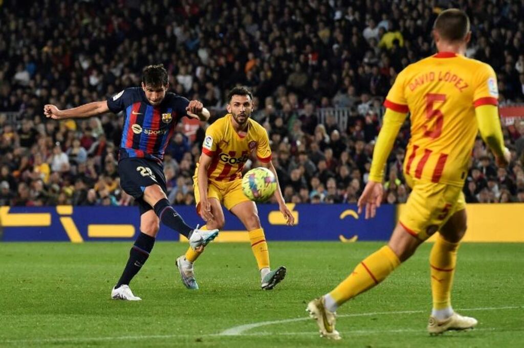 | Le milieu du Barça, Sergi Roberto (gauche), frappe au but contre Gérone, le 10 avril au Camp Nou. |