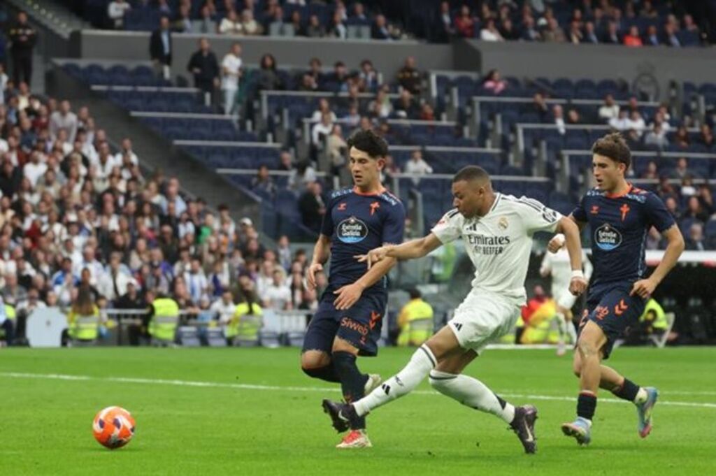 | Kylian Mbappé marque le 3e but du Real Madrid contre le Celta Vigo en Liga au stade Santiago Bernabeu de Madrid, le 4 mai. |