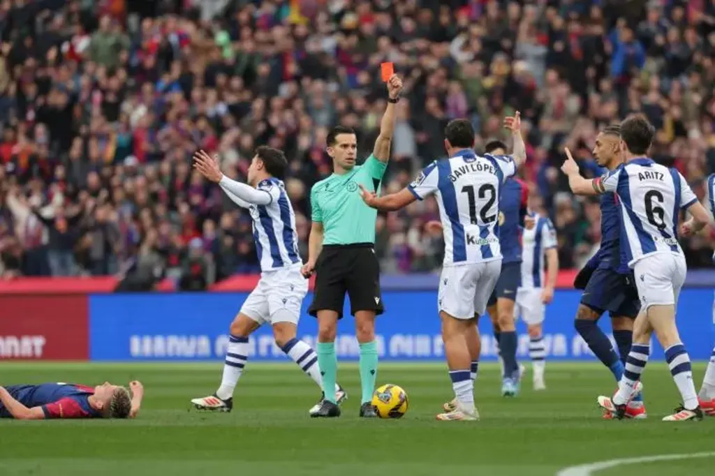 | L'arbitre Quintero Gonzalez expulse le joueur de la Real Sociedad, Aritz Elustondo (droite, N°6), lors du match de championnat d'Espagne contre le FC Barcelone au Estadi Olimpic Lluis Companys à Barcelone, le 2 mars. |
