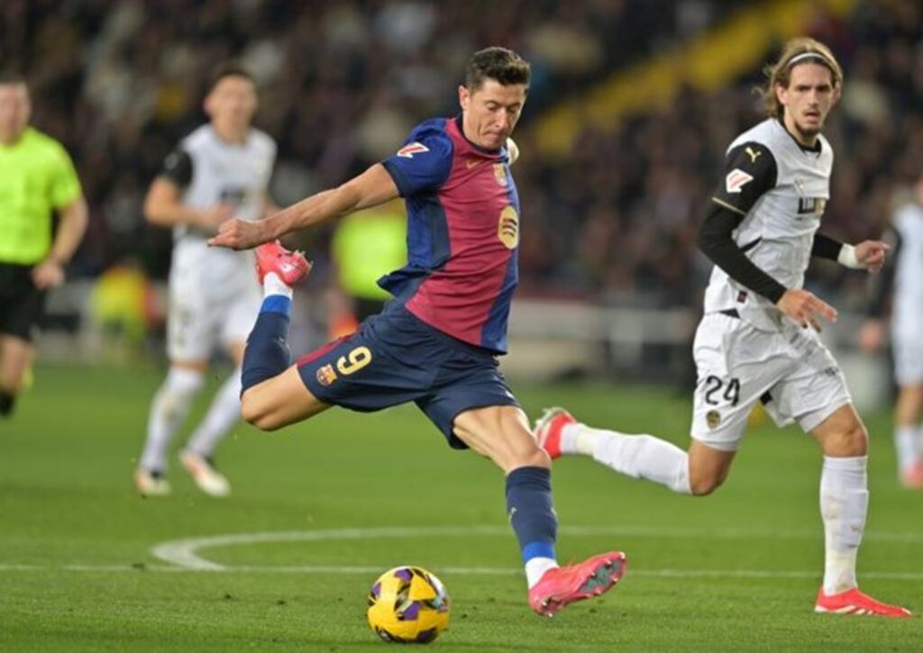 | Robert Lewandowski, meilleur buteur de Liga, a encore marqué lors de la démonstration du Barça contre Valence (7-1), lors de la 21e journée du Championnat d'Espagne, le 26 janvier à Barcelone |