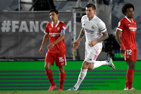| La joie du milieu de terrain allemand du Real Madrid, Toni Kroos, après l'égalisation (2-2) face à Séville, lors de leur match de Liga, le 9 mai au stade Alfredo di Stefano à Valdebebas, dans la banlieue de Madrid. |