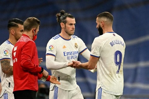 | L'attaquant français du Real Madrid Karim Benzema est remplacé par le Gallois Gareth Bale, lors du match contre Getafe, comptant pour la 31e journée de LaLiga, le 9 avril au stade Santiago. |