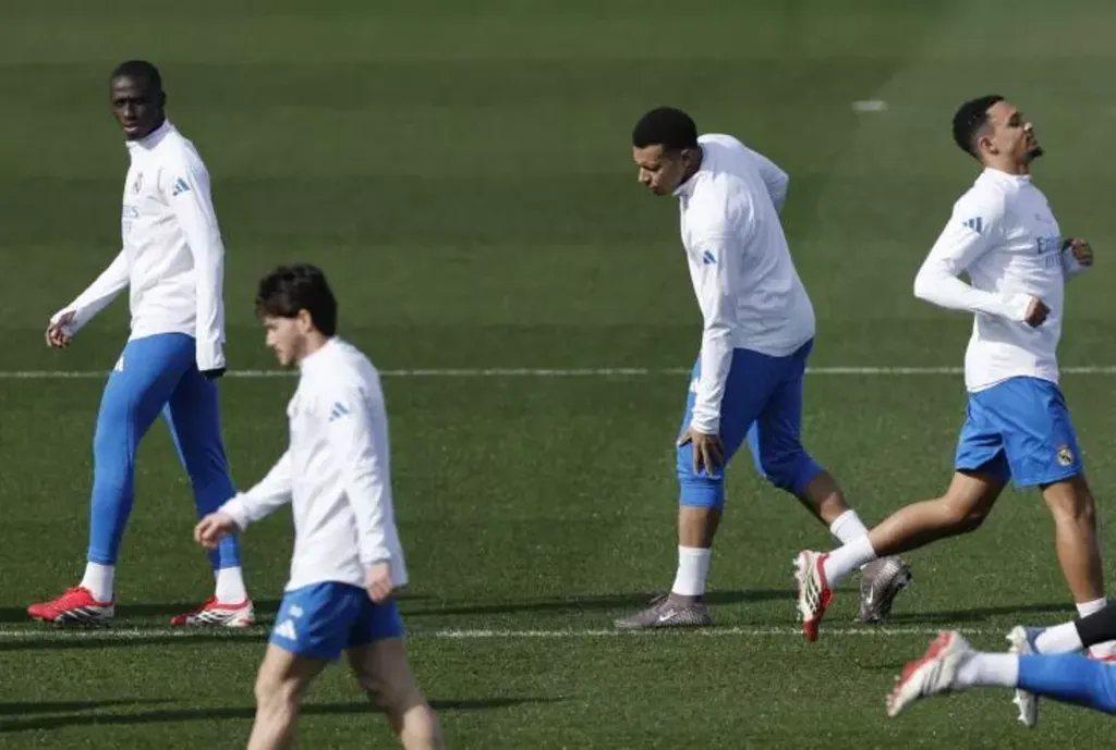 | Kylian Mbappé (centre) se tenant le genou gauche lors d'un entraînement du Real Madrid le 24 février à Valdebebas avant le barrage retour de Ligue des champions face à Benfica Lisbonne. |
