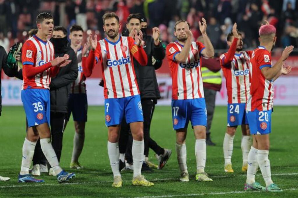 | La joie des joueurs de Gérone, leaders de la Liga, après leur victoire 5-1 contre Séville, le 21 janvier à Gérone. |