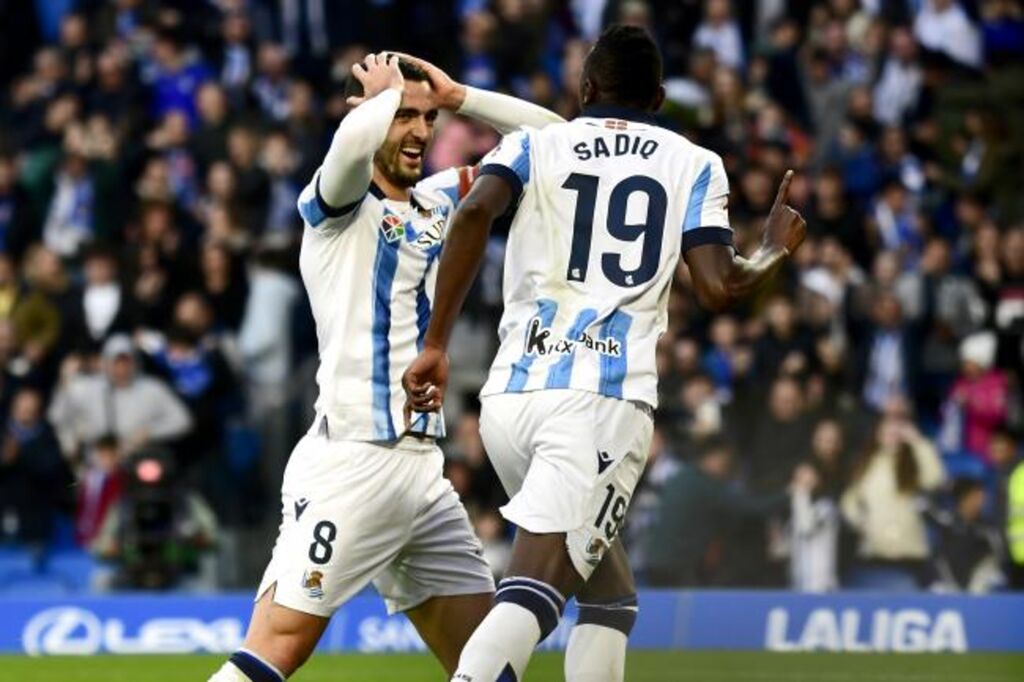 | L'attaquant nigérian de la Real Sociedad Umar Sadiq célèbre son but avec le milieu espagnol Mikel Merino au stade Anoeta de Saint-Sébastien, le 26 novembre. |
