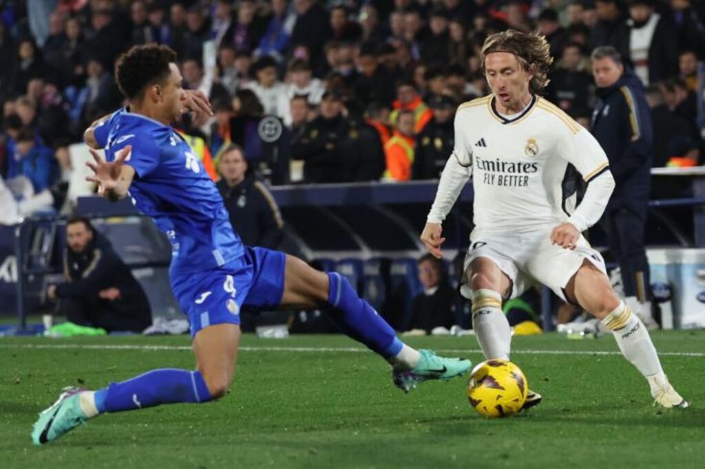 | Le milieu du Real Madrid Luka Modric (d) face au défenseur de Getafe Gaston Alvarez, le 1er février 2024 à Getafe. |