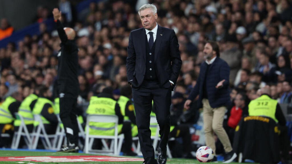 | L'entraîneur italien du Real Madrid, Carlo Ancelotti, déçu après le match nul 0-0 de son équipe contre le Rayo Vallecano au stade Santiago-Bernabeu de Madrid, le 5 novembre. |