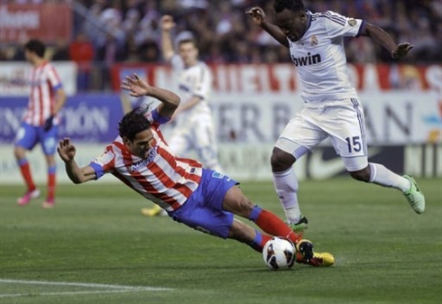 | L'attaquant de l'Atletico, Radamel (gauche), et le mileu de terrain du Real, Michael Essien, le 27 avril à Madrid. Photo : AFP/VNA/CVN |