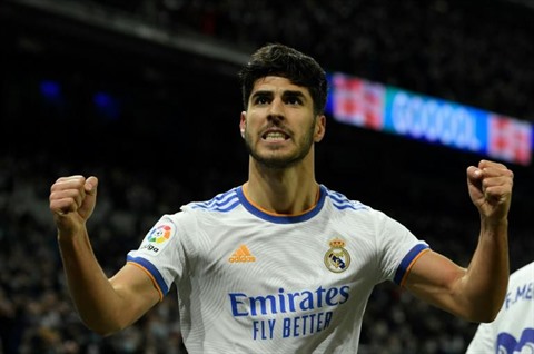 | La joie du milieu de terrain du Real Madrid, Marco Asensio, après avoir marqué le 2e but contre l'Atlético Madrid, en clôture de la 17e journée de Liga, le 12 décembre au Stade Santiago-Bernabeu. |
