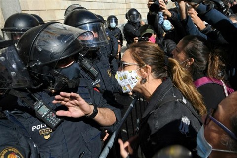 | Des manifestants affrontent la police devant la Generalitat, le siège du gouvernement régional catalan, le 16 octobre, protestant contre la fermeture de bars et restaurants pour lutter contre la pandémie. |