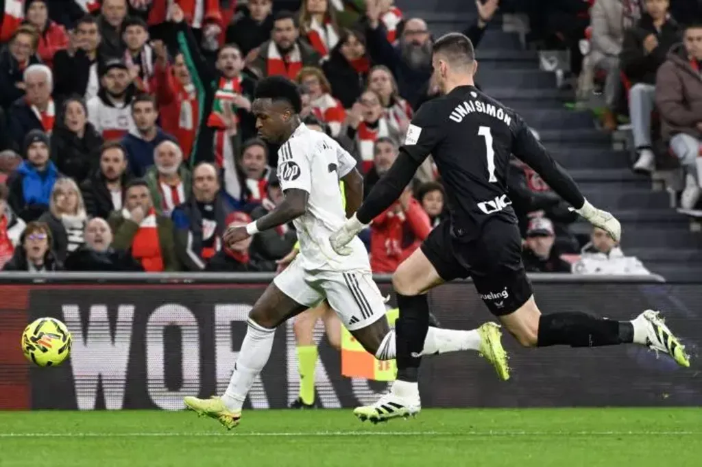 | L'attaquant brésilien du Real Madrid Vinicius Jr. face au gardien de Bilbao Unai Simon, lors de la victoire du club madrilène (3-0), mercredi 3 décembre, à Bilbao. |