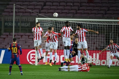 La superstar catalane a ouvert le score avec ce coup franc direct venu se loger dans la lucarne basque (20e), puis Antoine Griezmann a poussé l'offrande d'Oscar Mingueza dans les filets (75e) pour sceller le succès catalan, tandis que Jordi Alba avait permis aux Basques d'égaliser avec un but contre son camp (49e).