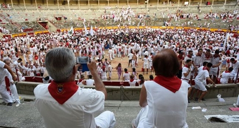 | Des spectateurs à la corrida, le 9 juillet 2016 à Pampelone. |