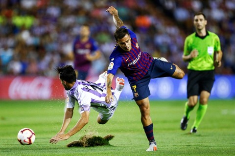 | Le défenseur espagnol Javi Moyano (gauche) tombe près du milieu brésilien du FC Barcelone, Philippe Coutinho, l |