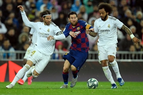 | Lionel Messi pris en tenailles par Sergio Ramos à gauche, et Marcelo à droite, lors du match entre le Barça et le Real Madrid au stade Bernabeu de Madrid le 1er mars. |