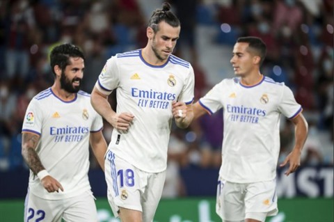 | L'attaquant gallois Gareth Bale (centre), après avoir ouvert le score face à Levante, lors de leur match de Liga, le 22 août à Valence. |