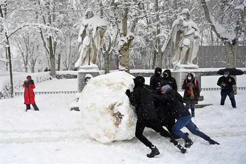 | Des jeunes font une boule de neige géante à Madrid, le 9 janvier. |