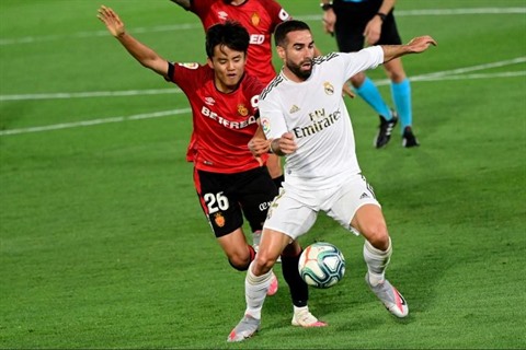 | Takefusa Kubo (gauche) aux prises avec le défenseur du Real Madrid, Dani Carvajal, lors du match de Liga à Valdebebas, le 24 juin. |