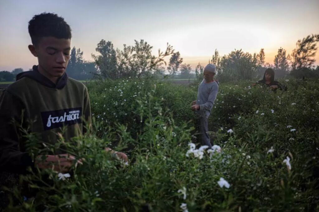 | La récolte des fleurs de jasmin dans les champs du delta du Nil en Égypte. |