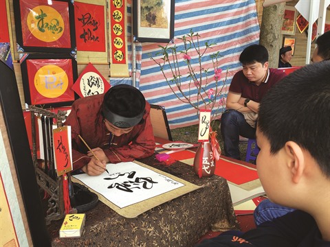 L’achat de la calligraphie est aussi un divertissement qui mérite une mention particulière. Jadis, avant le Têt, les gens allaient souvent chez un calligraphe pour demander des caractères chinois qu’ils accrochaient dans leurs maisons, en espérant que l’idéogramme choisi influencerait positivement la vie des membres de la famille pour l’année.