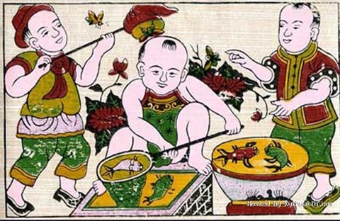 Mais, de nos jours, seule une poignée d’artistes sont encore en activité. Dans l’école Dông Hô, la nécessité de répondre aux besoins du Têt a conduit, il y a bien plus d’un siècle déjà, à reproduire plutôt qu’à peindre au sens strict du terme, en employant des techniques de gravure sur bois. Les thèmes demeurent, en revanche, avec les classiques vœux de chance, des personnages historiques, des scènes d’activités quotidiennes et allégories folkloriques, thèmes qui répondent à un réel besoin spirituel des Vietnamiens, non seulement pour décorer la maison les jours précédant le Nouvel An lunaire, mais pour rendre certains cultes...