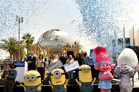 | Le gouverneur de Californie, Gavin Newsom (derrière au centre), lors d'une cérémonie organisée pour marquer "la réouverture complète de l'économie californienne", au parc d'attractions Universal Studios Hollywood, le 15 juin |