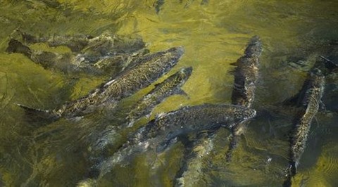 | Des saumons chinook nagent au sein d'une écloserie près du Lac Oroville, en Californie. |