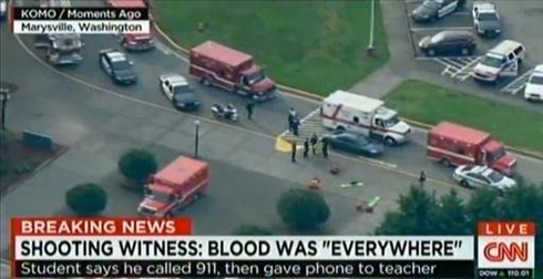 | Capture d'écran de CNN et KOMO TV News montrant l'arrivée de la police et des ambulances au lycée de Marysville-Pilchuck, près de Seattle le 24 octobre 201 |