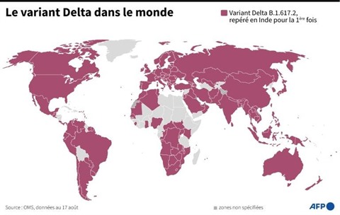| Carte des pays du monde où le variant Delta du coronavirus a été détecté selon l'OMS, au 17 août. |