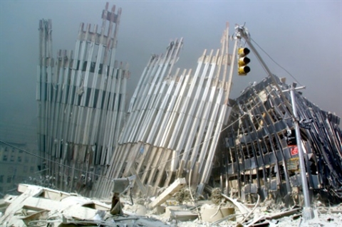 | Photo montrant une partie des tours jumelles détruites le 11 septembre 2001 à New York. |