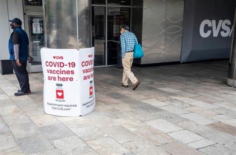 | Un panneau proposant la vaccination contre le COVID-19 devant une pharmacie CVS, le 7 mai à Washington. |