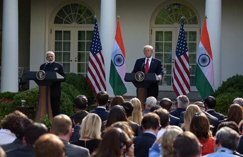 | Le président américain Donald Trump (droite) et le Premier ministre indien Narendra Modi, lors d'une conférence de presse, le 26 juin à la Maison-Blanche. |
