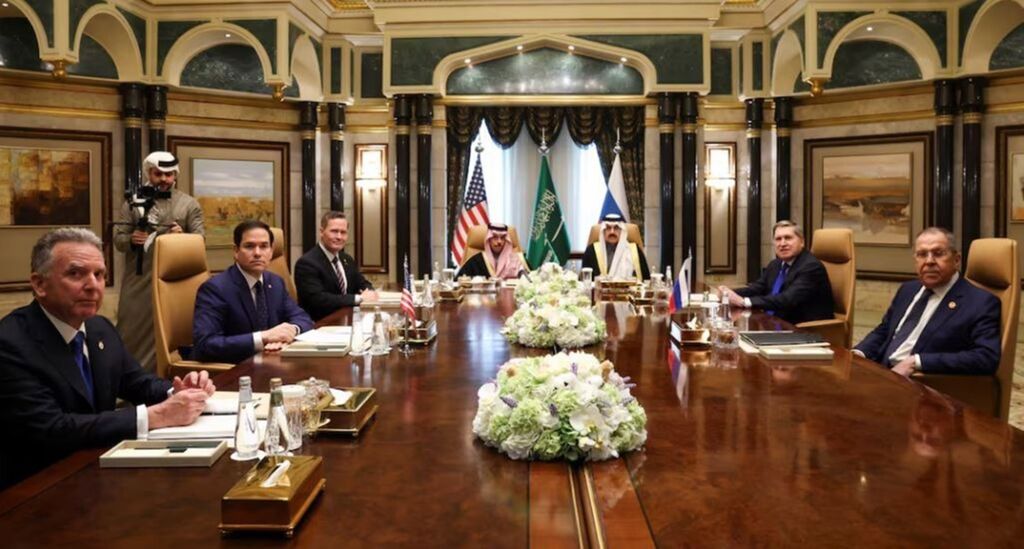 | Le ministre russe des Affaires étrangères Sergueï Lavrov (1er, droite) et le secrétaire d'État américain Marco Rubio (2e, gauche) lors des négociations à Riyad, Arabie saoudite, le 18 février. |