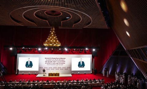 | Le secrétaire d'État américain Mike Pompeo s'adresse à la cérémonie de signature de l'accord entre les États-Unis et les talibans afghans. |