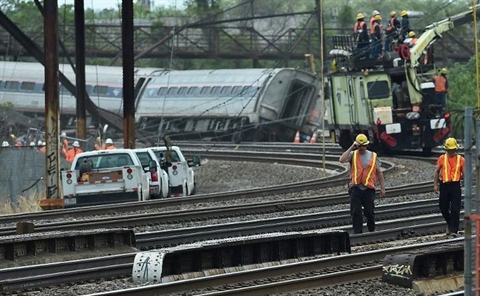 | Inspection des rails près du train qui a déraillé à Philadeplphie, le 13 mai |